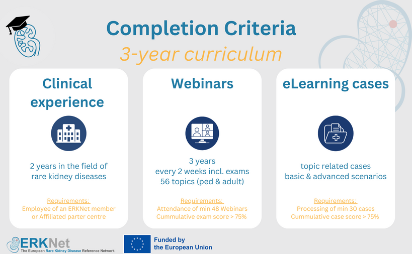The ERKNet Postgraduate Curriculum is a structured 3-year online programme consisting of webinars and case-based eLearning covering the whole spectrum of rare kidney diseases. The webinars are presented twice a month by outstanding paediatric or adult nephrologists, nephropathologists and geneticists. Additionally, we offer eLearning cases that present scenarios of patients with rare kidney diseases, allowing the students to establish a diagnosis and choose appropriate therapeutic strategies.