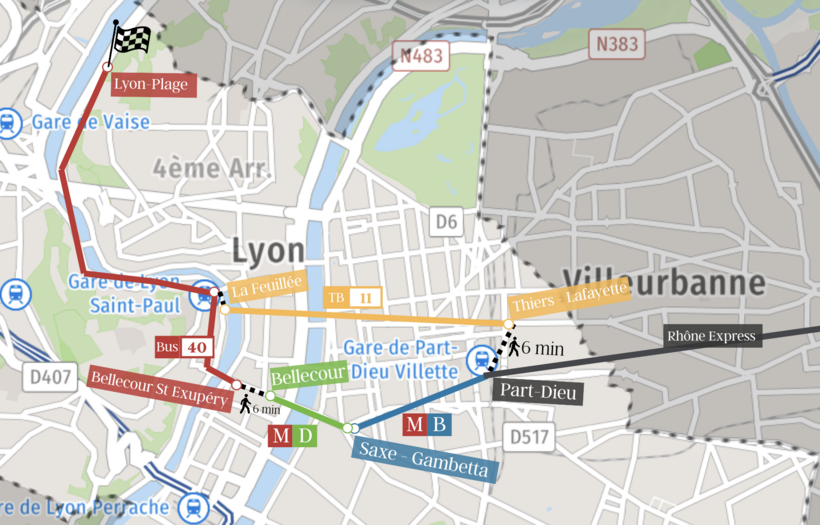 The first option involves two transfers — one at “Saxe-Gambetta” and another at “Bellecour.” Lyon’s metro system is highly efficient, with trains running every 3–5 minutes: