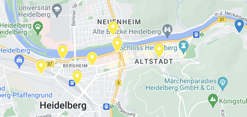 An overview of the yellow highlighted and suggested hotels in Heidelberg can be found on this map.