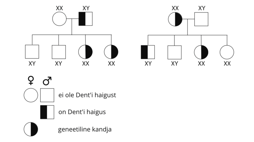 Poisid pärivad X-kromosoomi alati emalt ja Y-kromosoomi isalt – seega saavad Dent’i haiguse pärida ainult oma emalt. Kui ema on CLCN5 või OCRL1 mutatsiooni kandja, on 50% tõenäosus, et ta annab mutatsiooni edasi oma mõlemast soost lastele. Tüdrukud siiski ei haigestu, sest nad saavad isalt terve X-kromosoomi. Poistele jääb aga üks muteerunud X-kromosoom, sest nad pärivad isalt Y-kromosoomi.