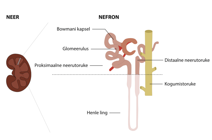 Neerutuubul | nefroni osa, kus toimub neerupäsmakesest pärit esmase uriini molekulide eritamine ja tagasiimendumine Tuubulites töödeldakse ööpäevas umbes 150 liitrit esmast uriini, mille tulemusel eritub põiest umbes 1,5 liitrit uriini. Tuubulus koosneb mitmest osast: proksimaalne tuubulus, Henle’i ling, distaalne tuubulus ja kogumistoruke |