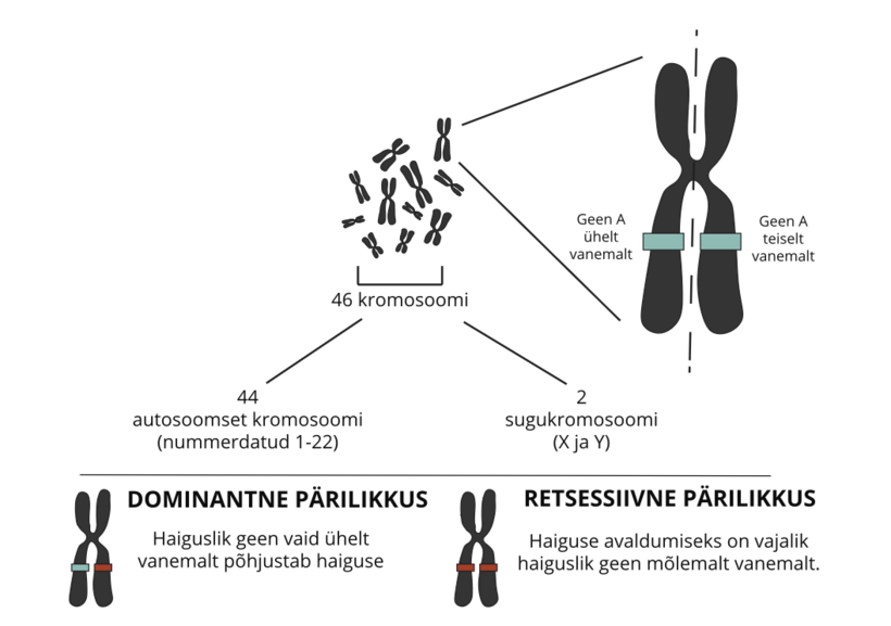 Igal inimesel on enamikus rakkudes 46 kromosoomi. Need on 22 paari autosoomseid kromosoomi ja 1 paar sugukromosoomi, st X ja Y. Kromosoomid pärandatakse vanematelt, 23 emalt ja 23 isalt, seega on igal inimesel 2 täielikku 23 kromosoomi komplekti ehk 23 „paari“. Kuna kromosoomid koosnevad geenidest, pärivad kõik inimesed enamiku geenide 2 koopiat, ühe koopia mõlemalt vanemalt. Sugukromosoomide puhul on olukord veidi teistsugune, kus meessugupoolel on üks X- ja Y-kromosoom ning naissugupoolel vastavalt kaks X-kromosoomi.