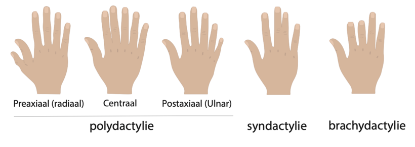 Extra vingers/tenen (polydactylie) | Kortere vingers/tenen (brachydactylie) Vergroeide vingers/tenen (syndactylie) |