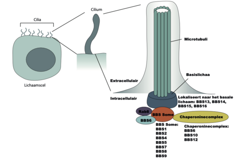 Bij BBS zijn genen aangedaan die coderen voor eiwitten die belangrijk zijn voor de functie en ontwikkeling van cilia. Een primair cilium bestaat uit een basaal lichaam (donkerblauw) en een buisachtige structuur (groen) opgebouwd uit microtubuli. De 24 verschillende BBS-eiwitten hebben verschillende functies binnen het cilium.