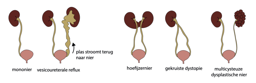 Vesicoureterale reflux - hierbij stroomt de urine terug van de blaas naar de nieren. Dit kan bijdragen aan de ontwikkeling van urineweginfecties.