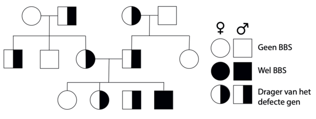 BBS is een autosomaal recessieve ziekte, wat betekent dat er twee afwijkende kopieën van een bepaald gen nodig zijn om de ziekte te krijgen. Meestal zijn de ouders gezonde dragers en vertonen ze geen symptomen, omdat ze elk slechts één afwijkende kopie hebben. De genmutatie kan echter ook niet-erfelijk zijn, d.w.z. dat de vorming van de afwijkende kopie spontaan optreedt tijdens de ontwikkeling van het embryo. Dit wordt een “de novo mutatie” genoemd.