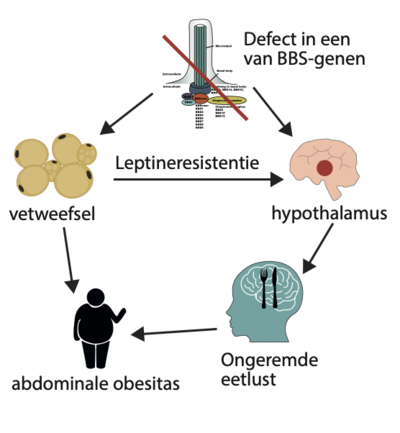 Leptine is een hormoon dat door vetcellen wordt geproduceerd. Het helpt de regulatie van de energiebalans door het hongergevoel te remmen. Leptine stuurt een signaal naar de hersenen dat aangeeft hoeveel vet er is opgeslagen in de vetcellen van het lichaam. Leptine bindt aan receptoren in de hypothalamus en reguleert eetgedrag. Bij obesitas treedt een verminderde gevoeligheid voor leptine op (zoals insulineresistentie bij diabetes type 2), wat leidt tot een onvermogen om een vol gevoel waar te nemen, ondanks hoge energievoorraden en hoge leptineniveaus. Deze aandoening staat bekend als leptineresistentie. Leptineresistentie leidt tot onbedwingbare honger en vermindert het aantal verbrande calorieën. Het is aangetoond dat BBS-eiwitten de leptinerespons beïnvloeden en het verlies van BBS-genen resulteert in leptineresistentie. Dit is een reden waarom veel BBS-patiënten zwaarlijvig zijn.