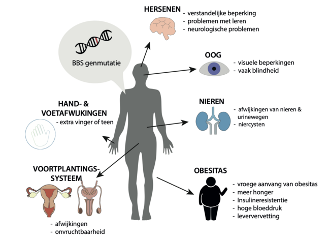 Defecte cilia in de hypothalamus (het hormoonproducerende gebied van de hersenen) beïnvloeden de werking van het verzadigingshormoon leptine, waardoor het lichaam niet meer weet wanneer het verzadigd is