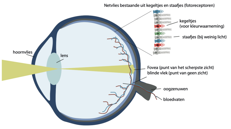 Het netvlies bevat twee soorten visuele receptoren (fotoreceptoren), namelijk staafjes en kegeltjes. Er zijn meer staafjes dan kegeltjes (ongeveer 120 miljoen versus 6 miljoen). Staafjes zijn gevoelig voor lichtintensiteit, maken zwart-wit beeld mogelijk en bevinden zich voornamelijk aan de rand van het netvlies. Kegeltjes zijn geconcentreerd in het centrale deel van het netvlies en zijn verantwoordelijk voor mkleurenzicht en gezichtsscherpte.