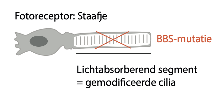 For Voor meer inzicht in de biologie achter de staafkegeldystrofie: Staafjes en kegeltjes zijn foto-elektrische cellen van het netvlies en hebben een speciaal lichtabsorberend segment. Deze segmenten bestaan uit gemodificeerde cilia. De BBS-mutatie leidt tot een verstoord eiwittransport tussen het lichtabsorberende segment en andere delen van de cel. Dit leidt tot afsterven van staafjes en kegeltjes en tot totale mnetvliesdegeneratie en blindheid.