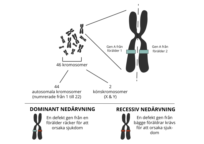 Varje människa har 46 kromosomer i de flesta celler. Dessa är 22 par autosomala kromosomer och 1 par könskromosomer, dvs. X och Y. Kromosomerna ärvs från föräldrarna, 23 från mamman och 23 från pappan, så varje person har 2 fullständiga uppsättningar av 23 kromosomer eller 23 “par”. Eftersom kromosomerna är uppbyggda av gener ärver alla 2 kopior av de flesta gener, en kopia från varje förälder. Situationen är något annorlunda när det gäller könskromosomer, där det vid manligt kön finns en X- och en Y-kromosom respektive två X-kromosomer vid kvinnligt kön.