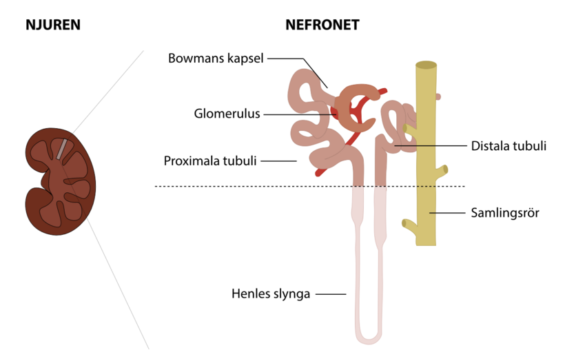 | Nefron | är den grundläggande funktionella och strukturella enheten i njuren, den består av två delar: njurfiltret (glomerulus) och tubulus där reabsorptionen äger rum |