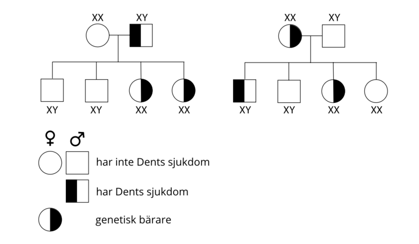 Dents sjukdom nedärvs recessivt kopplat till X-kromosomen. Detta innebär att sjukdomen vanligtvis endast drabbar män, eftersom kvinnor har två X-kromosomer, varav den ena kan kompensera för defekten hos den andra X-kromosomen.